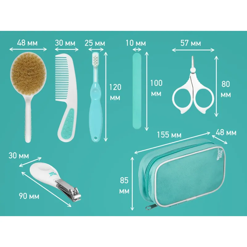 Setul include o perie de păr cu peri naturali, un pieptene, foarfece pentru manichiură, forfecut de tăiat unghii, penseta, 4 pile de unghii și o periuță de dinți.