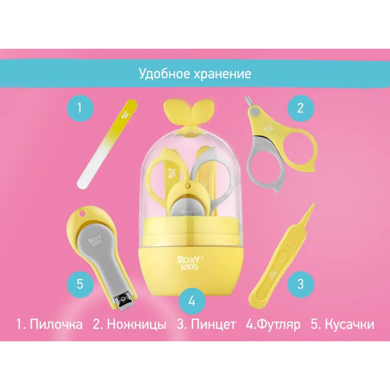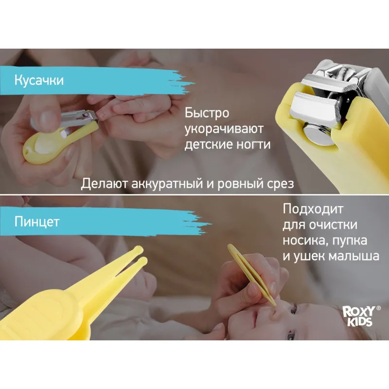 Foarfecele în miniatură sunt ideale pentru unghiile moi și mici ale bebelușilor, o pilă cu granulație fină va elimina unghiile neuniforme după tăiere, cleștele vor ajuta la tăierea îngrijită și uniformă a unghiei, penseta este potrivită pentru curățarea nasului, buricului și urechilor copilului.