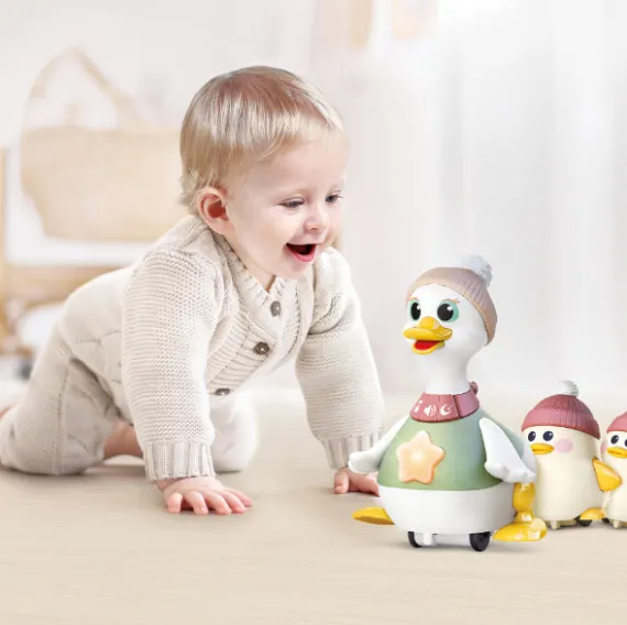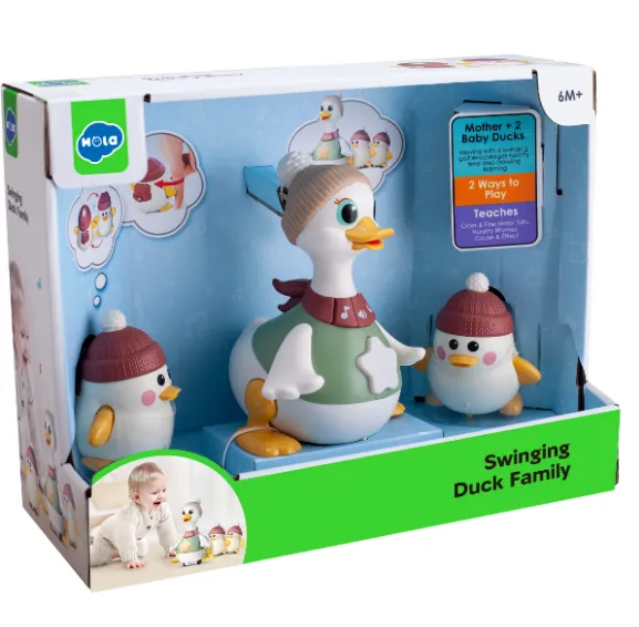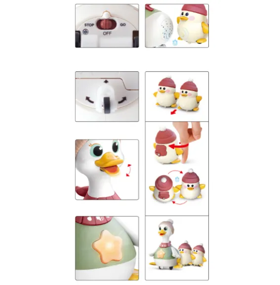 Setul include o rață mare și două rațuște mici. Mama rață mare poate merge alături de cele două rațuște mici, încurajând copilul să le urmeze și să interacționeze cu ele. La apăsarea butonului, jucăriile mici se pot roti, atrăgând atenția copilului și stimulând curiozitatea acestuia. Mama rață mare cântă 8 melodii vesele pentru copii, iar steaua de pe pieptul ei se aprinde, stimulând dezvoltarea vizuală (volumul poate fi reglat).