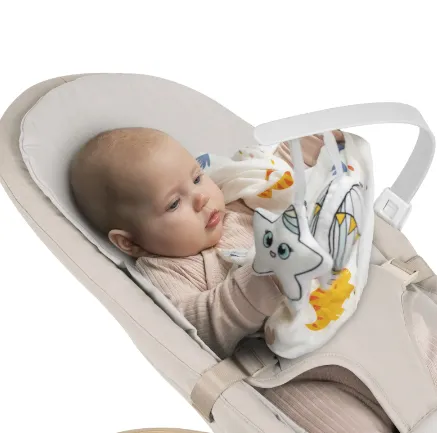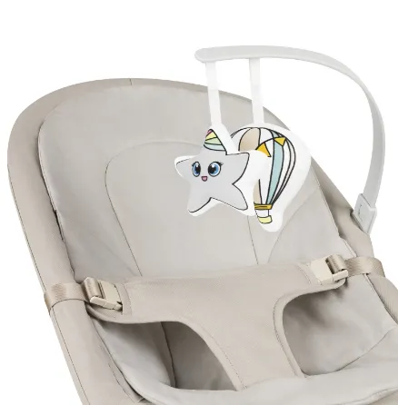 Bară de jucării detașabilă. Două jucării captează atenția bebelușului, încurajându-l să le atingă și să-și exerseze mâinile. Bara de jucării este detașabilă pentru confort.