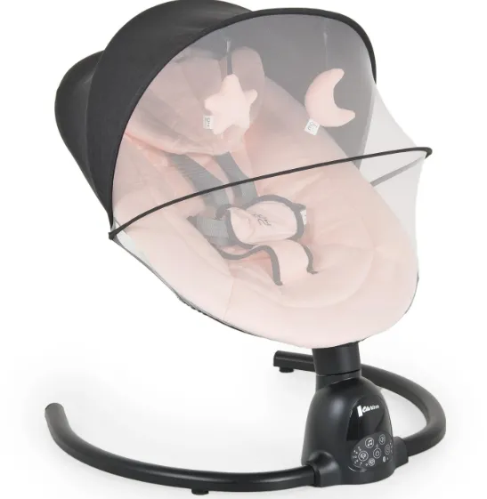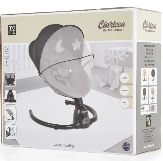 Leagănul electric Clarissa are un design elegant și curat, potrivit pentru orice interior. Are 5 viteze de legănare din care puteți alege. Leagănul are un senzor de mișcare încorporat, care poate activa automat legănarea atunci când copilul se mișcă. Cu ajutorul funcției Bluetooth, puteți reda muzică la alegere, în cazul în care nu doriți să utilizați cele 10 melodii disponibile. Leagănul funcționează doar cu un adaptor cu un cablu de 5m (inclus în set). Poate fi controlat fie prin panoul tactil al mecanismului, fie printr-o telecomandă. Opțional, puteți utiliza și temporizatorul cu opțiuni de 8, 15 și 30 de minute. Selectând una dintre aceste opțiuni, leagănul se oprește după intervalul specificat de timp. Centura de siguranță cu 5 puncte se va asigura de siguranța copilului. Produsul vine cu un parasolar cu plasă împotriva insectelor și 2 jucării de pluș. În set este inclusă și o pernă moale pentru confortul bebelușului. Tapiseria poate fi ușor îndepărtată pentru spălare. Leagănul poate fi demontat rapid și ușor de către un adult printr-o singură mișcare. În plus, construcția sa extrem de ușoară îl face convenabil pentru a fi transportat în altă cameră sau în călătorii.