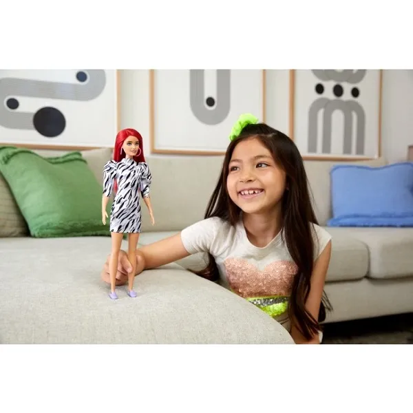 В комплекте кукла Barbie, которая одета в платье с принтом под зебру с пышными рукавами и стильные слипоны. Розовые сережки-кольца дополняют ее образ и так хорошо сочетаются с яркой прической.