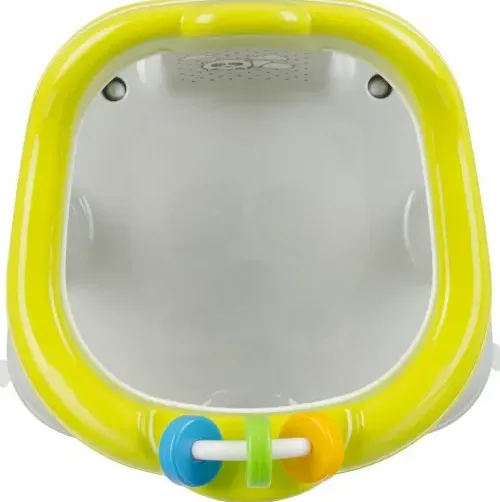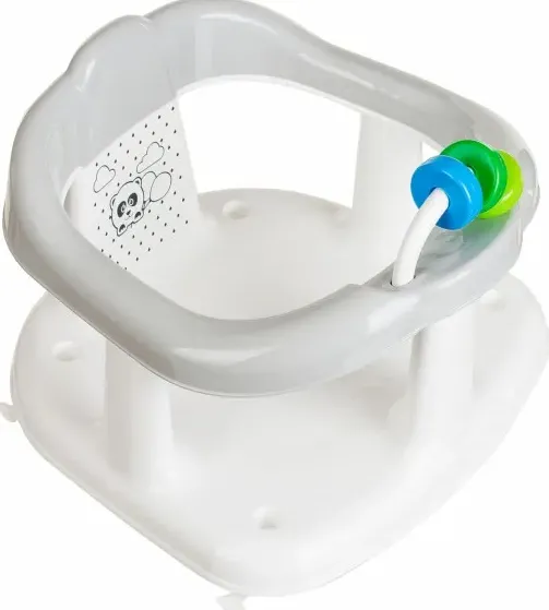 Produsul permite spălarea liberă a întregului corp fără efortul scăldatorului. Marginile interioare ale spătarului sunt finisate suplimentar cu elastomer, care protejează împotriva eventualelor abraziuni ale pielii. Produsul are un spătar înalt profilat sub spatele copilului, va fi o ușurare pentru întărirea coloanelor vertebrale a acestuia. Asigurând stabilitate și siguranță în timpul utilizării scaunului de către copil, pe baza acestuia sunt montate 4 ventuze, care garantează o fixare stabilă la asigurare. Jucaria, datorita formelor rotunjite, 3 cercuri colorate fac baia bebelusului si mai placuta. Produsul a fost decorat suplimentar cu autori de panda grafic, aplicat cu o metodă modernă sigură de aplicații de imprimare – IML.