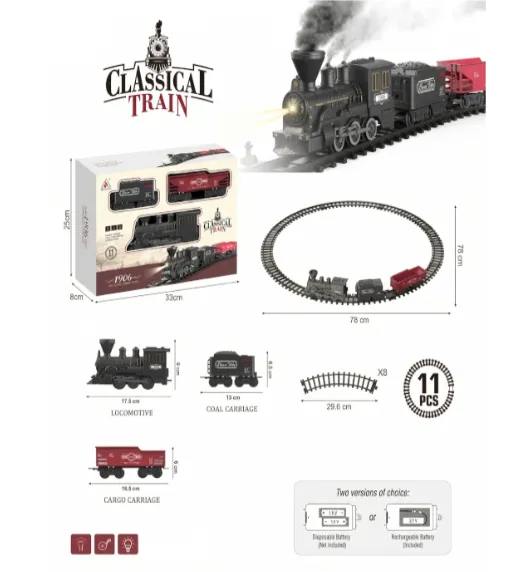 Setul de joacă „Calea ferată” cu 3 vagoane este un tren clasic pentru un joc captivant cu poveste. Setul include o locomotivă, 3 vagoane și elemente de cale ferată, cu ajutorul cărora copilul își poate construi propriul traseu. Setul este realizat în stilul trenurilor retro și este completat cu efecte luminoase și sonore, ceea ce face jocul mai realist și mai interesant.