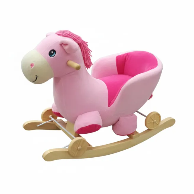 Acest cal de lemn va deveni un element frumos și îndrăgit în colecția de jucării a copilului dumneavoastră. Produsul este acoperit cu pluș moale, plăcut la atingere. Calul stimulează jocurile de rol, iar patinele stabile din lemn asigură o balansare sigură și lină.