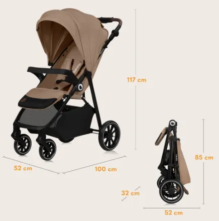 Căruciorul poate fi pliat cu o singură mână, fiind foarte convenabil pentru utilizarea zilnică. Când este pliat, rămâne în poziție verticală pentru a fi depozitat ușor. Cântărind doar 9,6 kg, căruciorul este ușor de transportat.