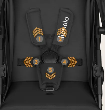 Copilul este securizat cu un ham reglabil în 5 puncte pentru protecție maximă. Hamul este echipat cu pernițe speciale pentru a proteja pielea bebelușului de frecare.