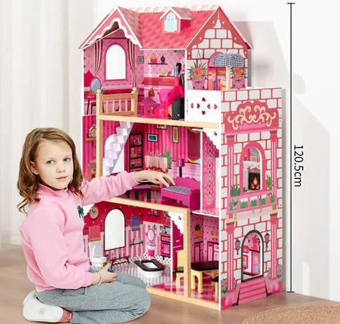 VILA MARE, MMK‑290‑136 este o casă de păpuși cu 3 etaje, cu o înălțime impresionantă de 120,5 cm, ideală pentru jocuri de rol și dezvoltarea creativității copiilor. Designul este inspirat dintr-o vilă de poveste, cu detalii roz și accente elegante.