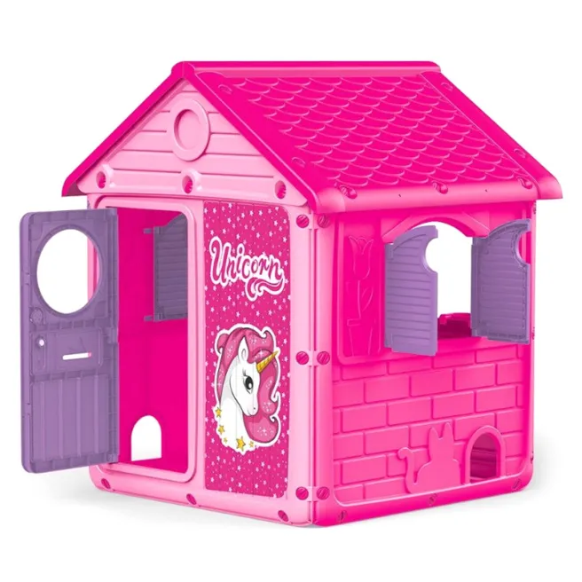 Această casă este concepută pentru joacă pentru copii atât în interior de dimensiuni potrivite, cât și în exterior. Are o colorare roz drăguță, precum și modele decorative cu unicorni pe ușa și pereții casei. Casă are o ușa care se deschide cu mâner confortabil. Acoperișul este în fronton, va proteja copiii de precipitațîi, astfel încât să vă puteți juca într-o astfel de casă în orice vreme. Casă are ferestre decupate prin care părinților le va fi confortabil să urmărească ce fac copiii înăuntru. Designul este bine gândit, este stabil și are o cameră spațioasă în interior.