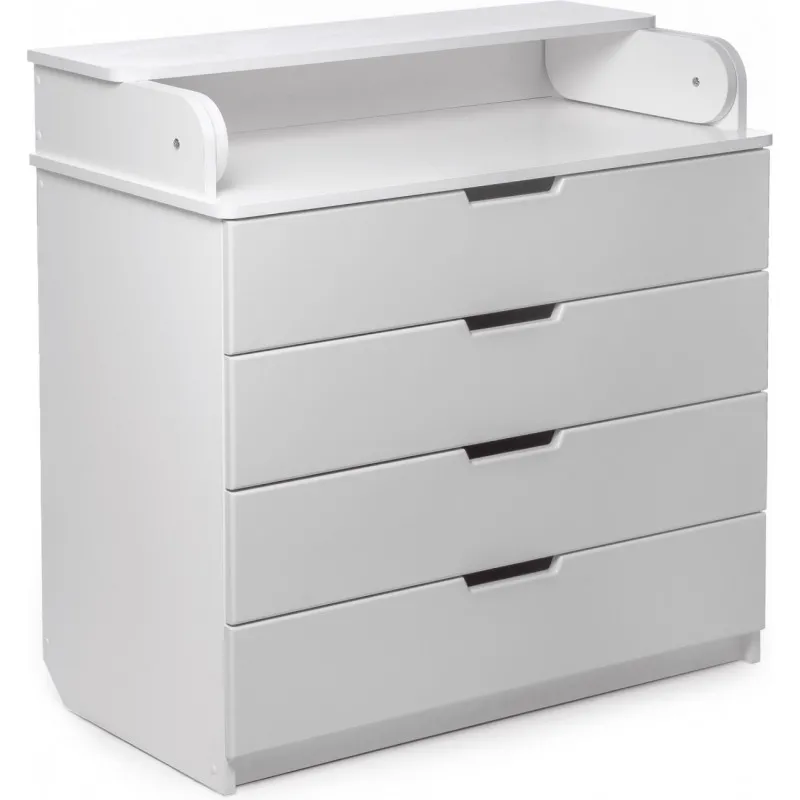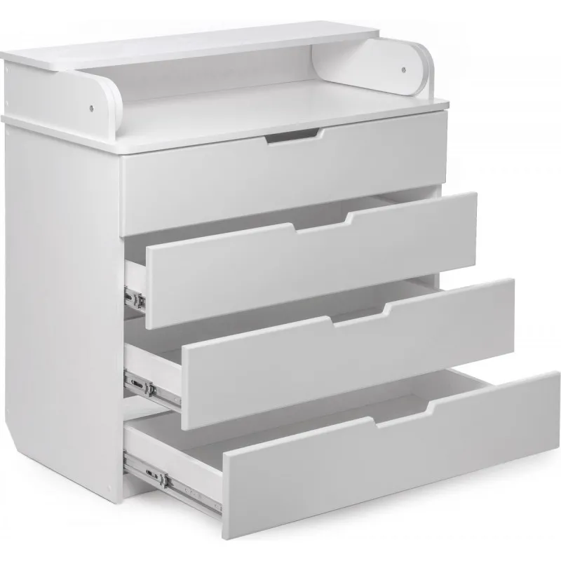 Partea superioară a comodei poate fi pliată cu ușurință și se transformă într-un loc de schimbare convenabil, care poate fi, de asemenea, îndepărtat cu ușurință dacă este necesar. Iar laturile rotunjite vă permit să nu vă faceți griji pentru siguranța copilului dumneavoastră.