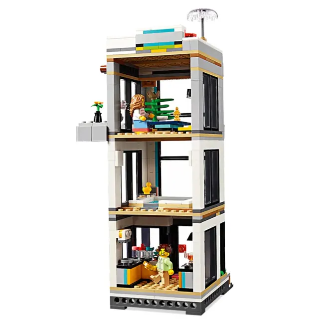 Băieții și fetele cu vârste de până la 9 ani pot descoperi 3 case LEGO diferite cu acest set distractiv Modern House. Casa luxoasă cu 2 etaje de pe plajă este umbrită de 2 palmieri și are o bucătărie, un living, o cameră de lectură, un dormitor, o cabină de duș, un balcon și mobilier modern, inclusiv un fotoliu și un candelabru. Există, de asemenea, o piscină pentru povești distractive. Acest set de construcție LEGO oferă o lume plină de posibilități, cu 3 case diferite de construit cu același set de cărămizi. Copiii pot construi o casă modernă, apoi o pot transforma într-o clădire de oraș elegantă cu 3 etaje, cu o cadă cu hidromasaj și o terasă pe acoperiș sau o pot transforma într-o cabană în pădure.