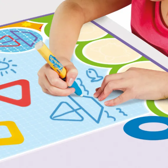 Conținutul pachetului: Setul include un covor, un marker Aquadoodle și trei șabloane cu forme geometrice.