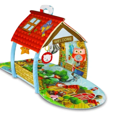 Functionalitate: saltea groasa cu un strat izolator de la suprafata; posibilitatea a două configurații - sub formă de covor plat cu arcade sau covor cu casă; design original care stimulează dezvoltarea simțurilor; jucării interactive