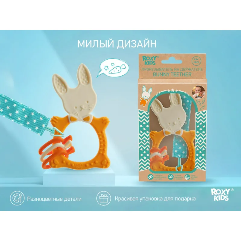 Teether BUNNY TEETHER de la ROXY-KIDS este potrivit pentru toate etapele de dentiție datorită elementelor de diferite grade de rigiditate.