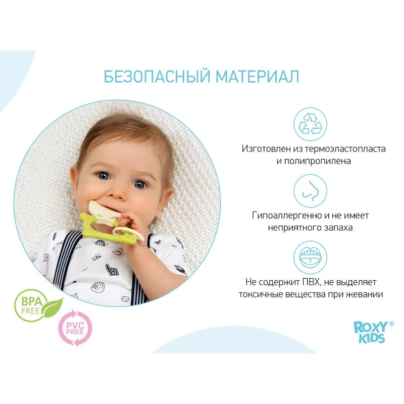Dentierul este fabricat din materiale hipoalergenice sigure (elastomer termoplastic si polipropilena), astfel incat bebelusul o poate mesteca pe tot parcursul zilei.