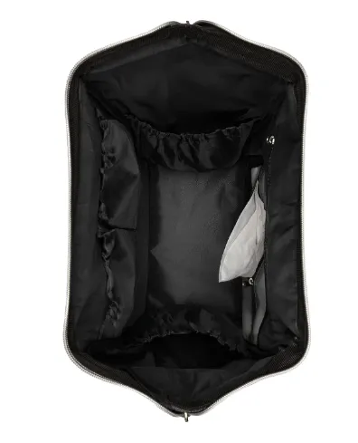 Buzunarul principal se deschide larg cu un cadru metalic de susținere pentru acces facil, având buzunare specializate pentru organizarea esențialelor, adaptate nevoilor părinților moderni.