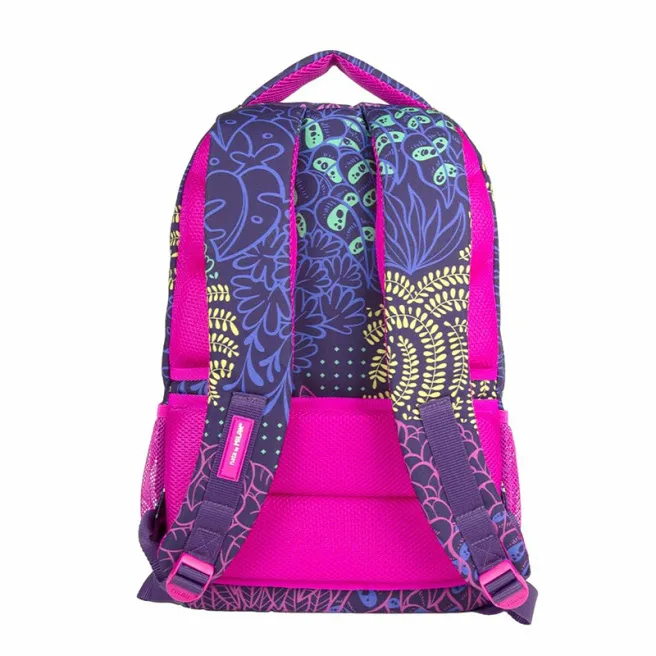 Ghiozdan școlar cu 2 fermoare. Serie specială Fireflies, un imprimeu creat prin diferite forme de vegetație și frunze, reprezentând mediul în care trăiesc licuricii. Culorile sunt la fel de strălucitoare ca lumina licuricilor: lila, fucsia, galben și verde, care ies în evidență pe o bază lila închis. Fermoare și detalii fucsia. Un buzunar principal cu compartiment interior protector pentru laptop și un buzunar frontal. Două buzunare laterale din plasă pentru acces ușor. Mânere reglabile, spate căptușit și respirabil, bază întărită. Permite adăugarea unui troler pentru rucsac. Compoziție din material: căptușeală exterioară și interioară din poliester. Dimensiuni: 45 x 30 x 12 cm. Capacitate: 21 de litri.