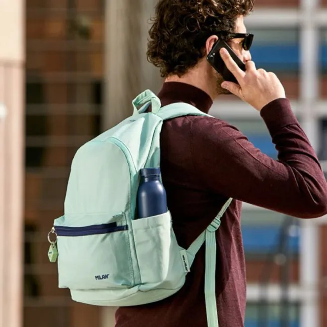 Rucsac urban clasic cu 2 fermoare. Seria 1918, culoare verde cu detalii bleumarin. Inspirat de culorile și designul originale ale radierelor MILAN, fabricate în Spania din 1918. Compartiment principal cu husă de protecție pentru laptop. Buzunar frontal și două buzunare laterale cu velcro cu acces rapid. Bretele reglabile, spate căptușit și respirabil. Buzunarul frontal include un inel de chei cu gumă de șters 430 pe mânerul cu fermoar. Captuseala interioara bleumarin imprimata cu o grila care evoca forma radierelor MILAN. Țesătură exterioară „Ripstop”: ușoară și rezistentă la coacere și rupere. Utilizează o tehnică specială care țese fire groase de armare la intervale regulate, creând un model încrucișat. Compoziția țesăturii: țesătură exterioară din poliester și căptușeală interioară. Dimensiune: 41 x 30 x 18 cm. Capacitate: 22 litri.