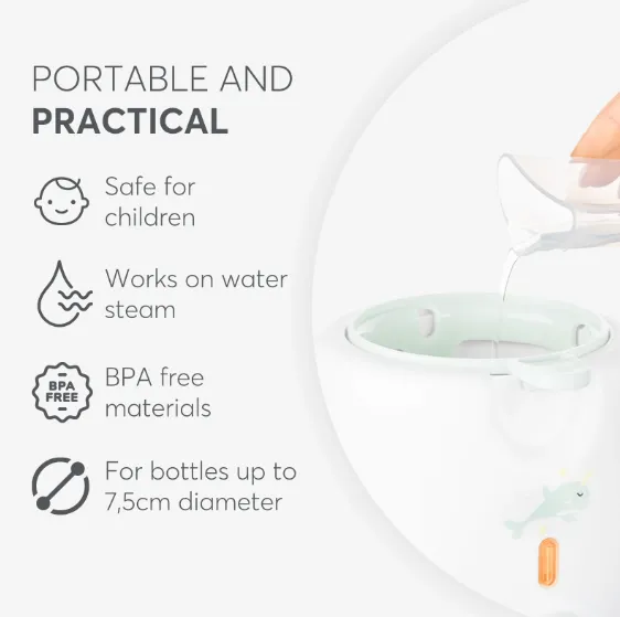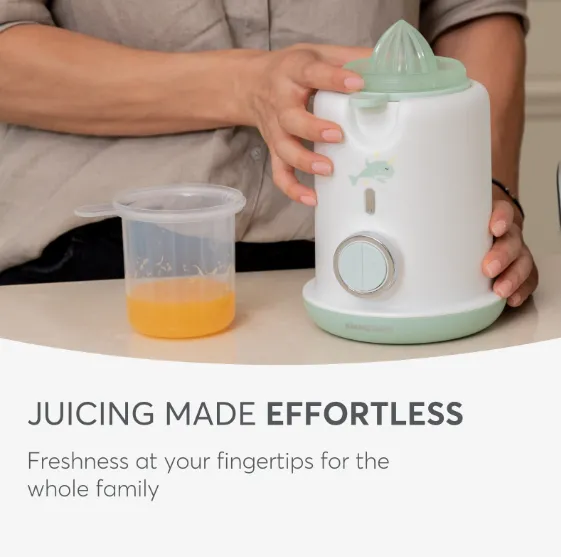 Funcționalitate 3 în 1 – poate fi utilizat ca încălzitor de biberoane, sterilizator (pentru un biberon) și storcător de suc, combinând mai multe funcții într-un singur aparat compact.