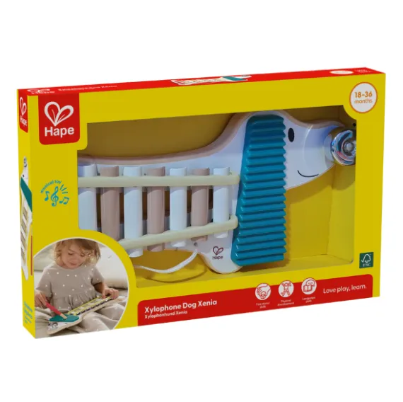 Adorabila cățelușă Xenia de la Hape nu este doar o jucărie, ci o prietenă muzicală specială pentru cei mici. Ea combină trei instrumente într-unul singur: xilofon, zornăitoare și un clopoțel pe năsuc. Copiii pot cânta la plăcile xilofonului cu bagheta, pot zgudui zornăitoarea sau pot face clopoțelul să sune, compunând primele lor melodii.