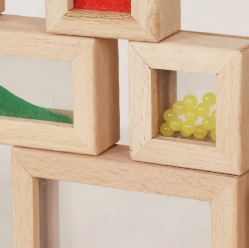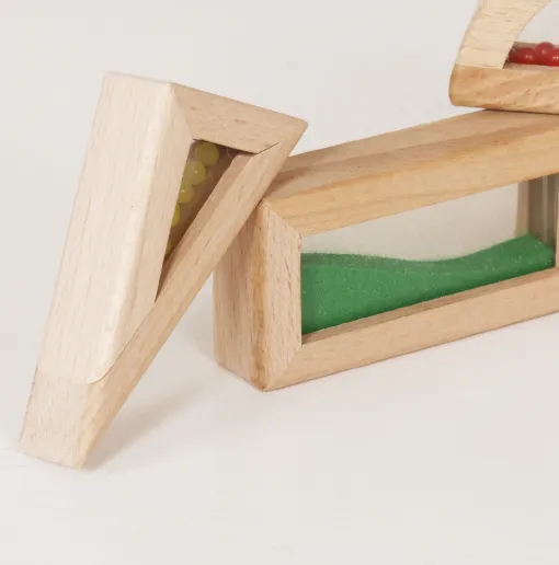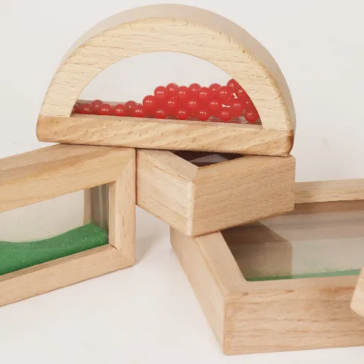 6 blocuri mari din lemn, umplute cu mărgele, acril transparent, nisip colorat și apă / sclipici, în 4 forme diferite (pătrat, dreptunghi, triunghi și semicerc).