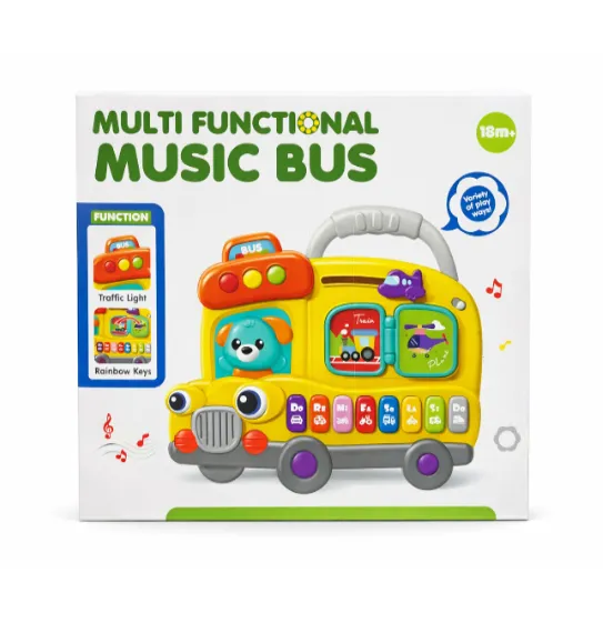„Music Bus” este o jucărie educativă colorată, care combină funcțiile unui instrument muzical, ale unui joc de sortare și ale unui cărucior distractiv. Realizat sub forma unui autobuz școlar galben și prietenos, acest centru de joacă atrage instantaneu atenția copilului prin multitudinea de elemente interactive.
