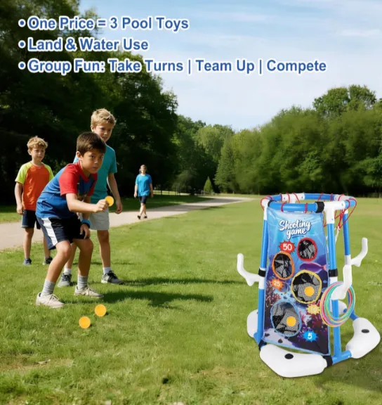 Acest centru de divertisment „3 în 1” combină baschetul, aruncarea inelelor și jocurile cu punctaj pentru aruncările cu mingea. Transformați instantaneu piscina pentru copii într-o arenă colorată de joacă, oferindu-le copiilor distracție de vară fără sfârșit.