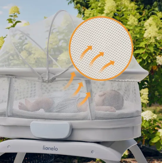 Părțile laterale sunt realizate din material de plasă pentru a asigura o circulație constantă a aerului, prevenind supraîncălzirea copilului. În plus, materialul din plasă oferă o vizibilitate excelentă atât pentru copil, cât și pentru părinți. Această caracteristică permite copilului să-și observe liber mediul înconjurător și să mențină contactul vizual cu îngrijitorii, oferind un sentiment reconfortant de siguranță. Designul din plasă permite părinților să monitorizeze bebelușul în orice moment, chiar și de la o distanță scurtă.