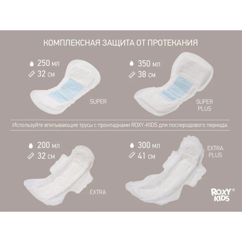 Vă recomandăm să le folosiți împreună cu tampoanele ROXY-KIDS pentru perioada postpartum: modelele Super (32 cm) și Super Plus (38 cm), precum și modelele cu aripioare Extra (32 cm) și Extra Plus (41 cm).