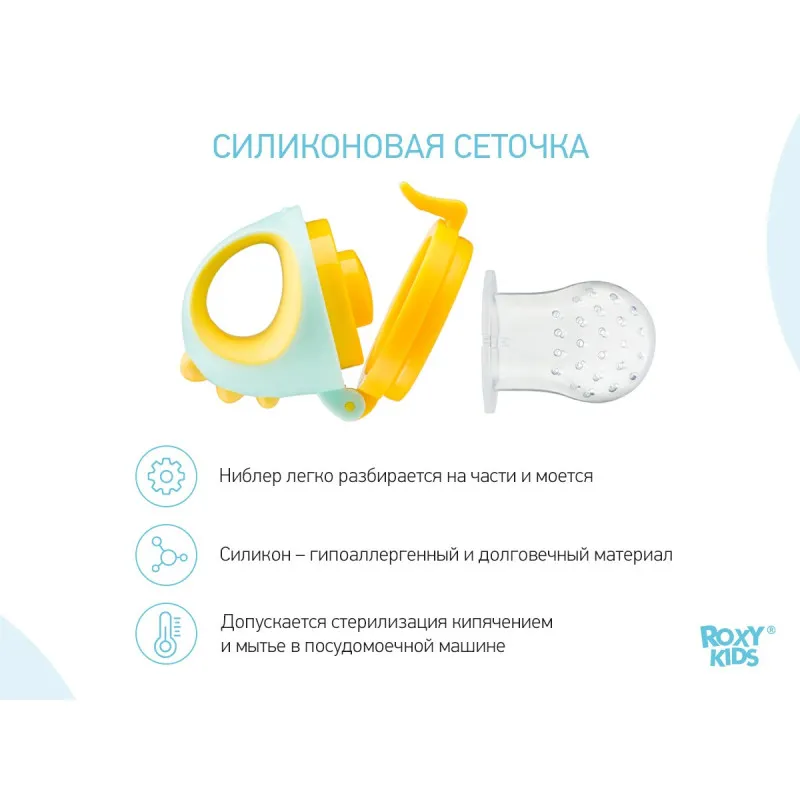 Niblerul pentru bebeluși de la ROXY-KIDS vă va ajuta să introduceți ușor și convenabil fructele, legumele și prăjiturile în dieta bebelușului dumneavoastră.