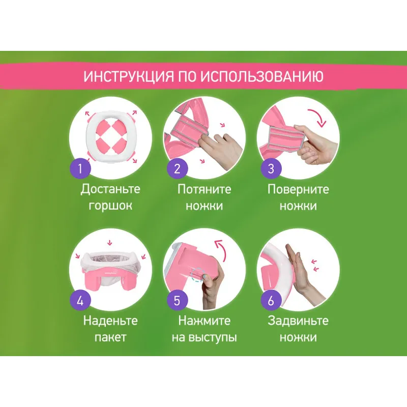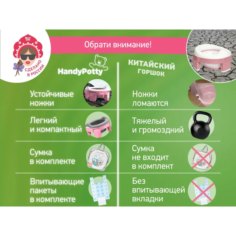 Acest instrument simplu combină funcțiile a trei accesorii: o olita obișnuită, o olita de călătorie și un adaptor de toaletă, făcând din HandyPotty o olita versatilă.