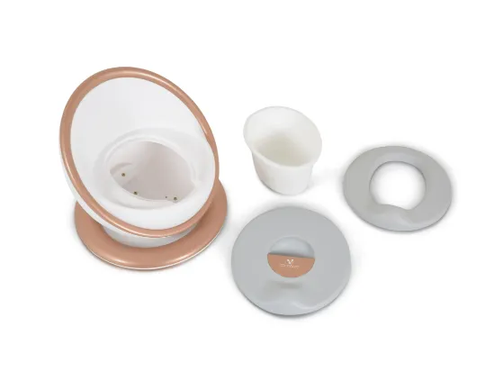Olița este echipată cu un spătar înalt, care susține copilul într-o poziție corectă și asigură o ședere confortabilă. În același timp, partea frontală mai înaltă protejează împotriva stropilor. Recipientul interior detașabil este practic și ușor de curățat, iar capacul încorporat oferă protecție suplimentară și menține igiena.