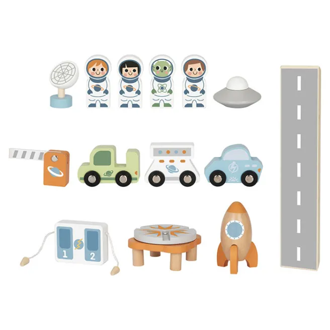 Lansează-ți imaginația cu setul de joacă Space Station de la Tooky Toy. Acest set din lemn cu mai multe niveluri combină aventura spațială și distracția cu vehicule: rampe, rampă de lansare a rachetelor și rampă de aterizare pentru OZN-uri. Cele 14 piese - roboți, astronauți, extratereștri, vehicule și accesorii - le vor permite copiilor să își creeze propriile povești spațiale din nou și din nou.