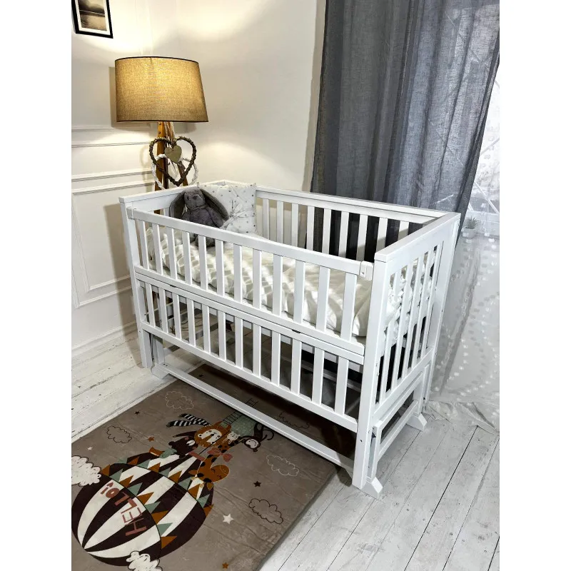 • Patul are un perete lateral rabatabil, un mecanism de legănare (pendul longitudinal) silențios pe rulmenți;