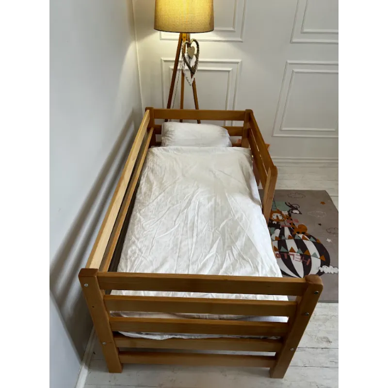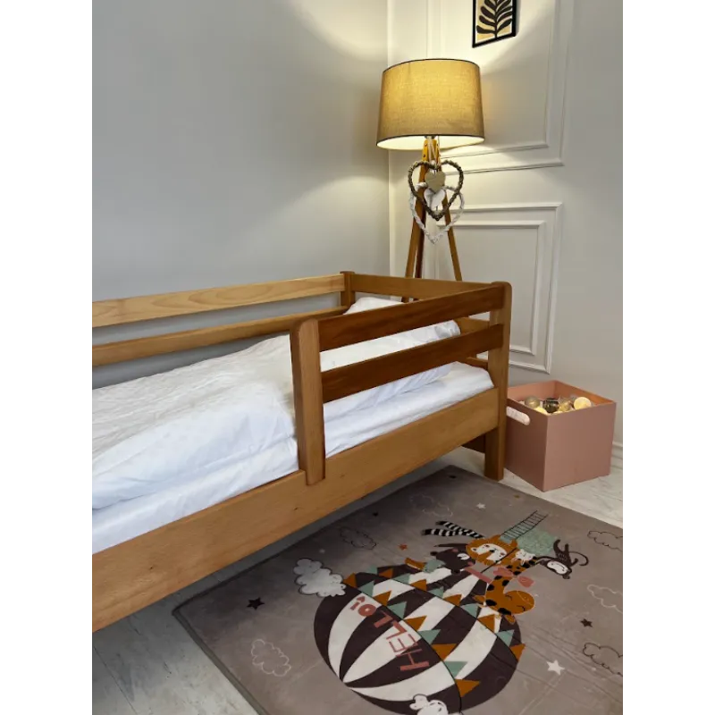Modelul are deasemenea o latura protectoare pentru siguranta copilului, care, daca se doreste, nu poate fi atașată. Este realizat din lemn masiv de fag, șlefuit cu grijă și acoperit cu vopsea ecologică pe bază de apă.