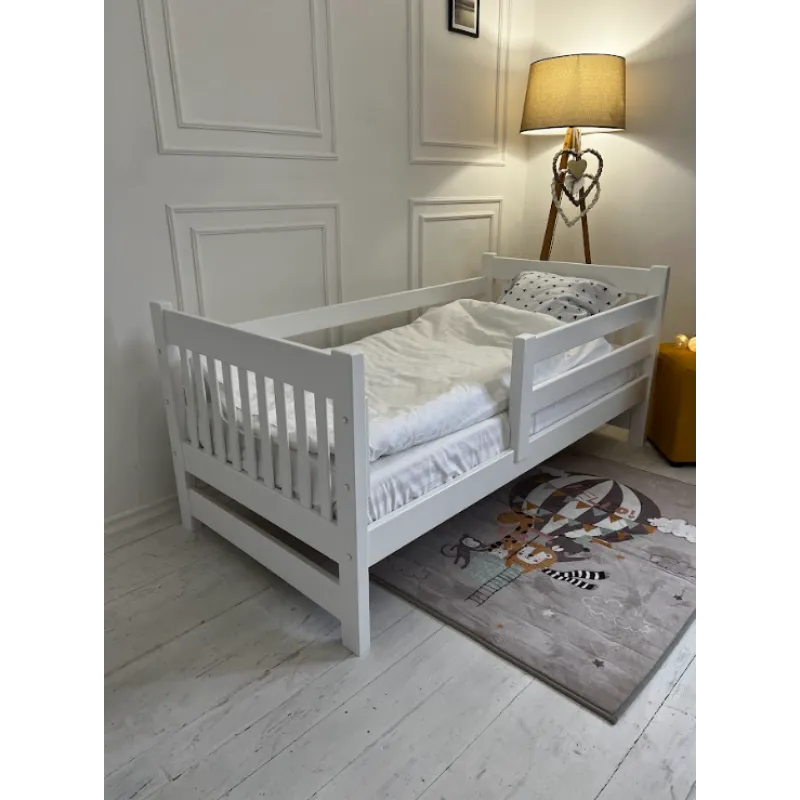 Modelul are deasemenea o latura protectoare pentru siguranta copilului, care, daca se doreste, nu poate fi atașată. Este realizat din lemn masiv de fag, șlefuit cu grijă și acoperit cu vopsea ecologică pe bază de apă.
