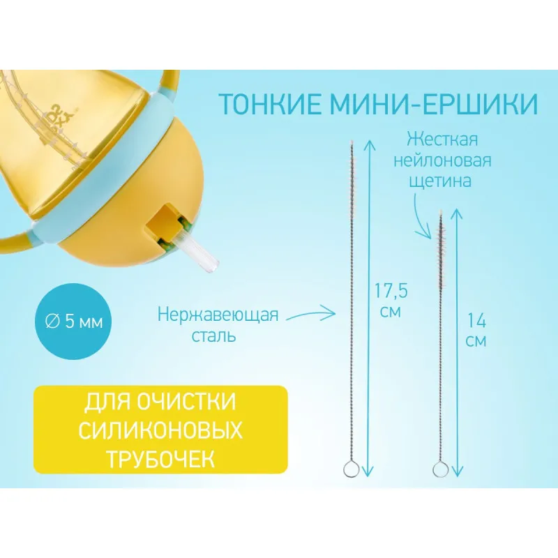 Setul include două accesorii înlocuibile pentru curățarea sticlelor, o perie mică pentru suzetă și două mini perii cu paie.