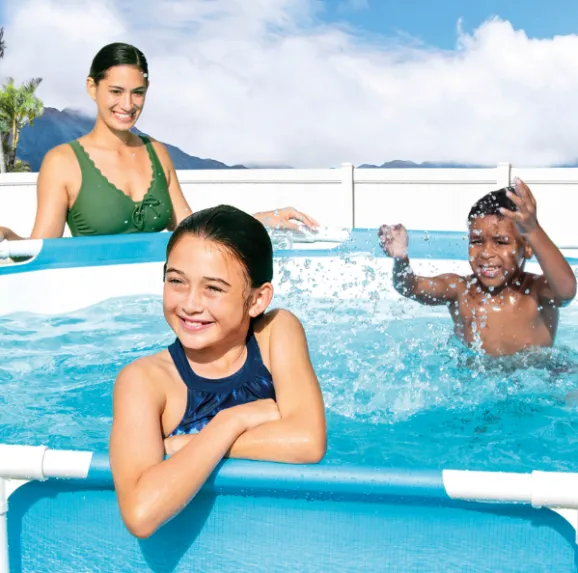 Piscină supraterană cu cadru metalic din seria Metal Frame Pool, cu design „Beachside”. Tehnologia patentată SUPER-TOUGH oferă pereților piscinei o rezistență triplă, fiind compuși din trei straturi: două straturi de vinil dens și un strat de poliester pentru o durabilitate ridicată. Cadrul metalic oferă stabilitate construcției și permite utilizarea piscinei de mai multe persoane simultan.