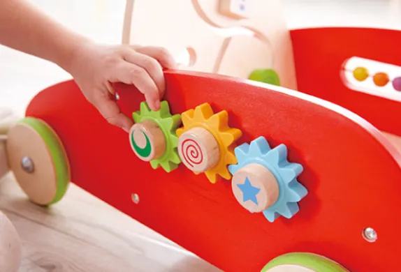 Antepremergător magic este completat cu detalii utile în dezvoltarea bebelușilor – roți dințate multicolore rotative, un labirint, mărgele, mânerul comod ușor în manevrarea jucăriei. Antepremergătoarul poate fi folosit și pe post de cărucior de joacă. Roțile sale sunt acoperite cu cauciuc, astfel nu lasă urme pe podea. Datorită ampatamentului larg, premergătorul este stabil.