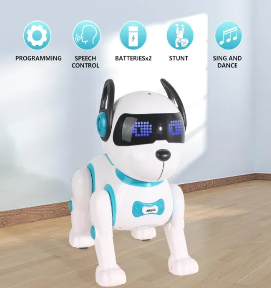 Câinele robot telecomandat este o jucărie multifuncțională pentru dezvoltarea timpurie, care poate spune povești, cânta cântece pentru copii, dansa, preda limba engleză și imita vocile diverselor animale, oferind copiilor o gamă variată de oportunități de învățare și divertisment.