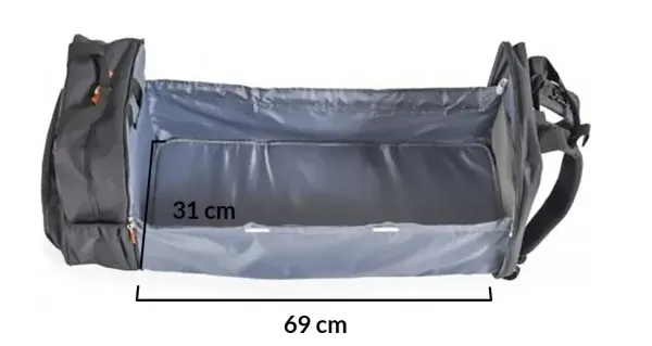 Acest produs unic este extrem de util și necesar pentru fiecare părinte. Este multifunctionala si ofera 2 produse in 1 - o geanta si un pat portabil pentru bebelusi. Are un buzunar frontal cu fermoar și buzunare laterale cu depozitare elastică, unde poți depozita tot ce ai nevoie. Accesoriile incluse cu produsul - două mânere scurte și două mânere lungi, cleme pentru atașarea ușoară la mânerul căruciorului, deschidere largă a buzunarelor principale pentru un acces mai ușor.