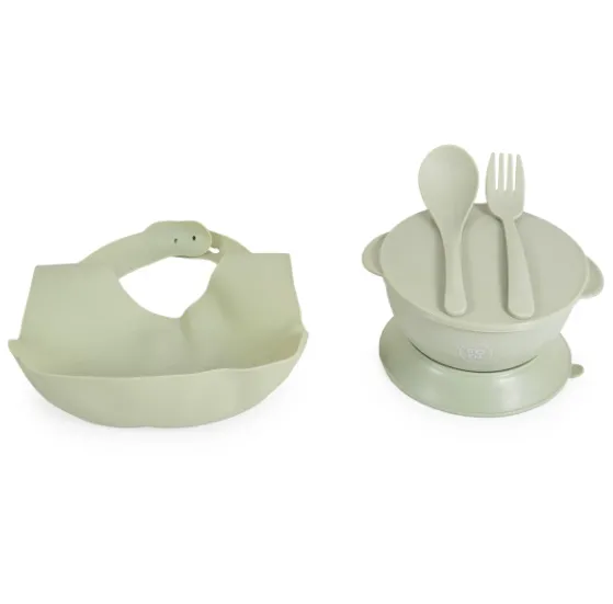 Bavetă din silicon, bol cu capac și bază antiderapantă, linguriță și furculiță – tot ce are nevoie micuțul tău pentru primele mese independente.