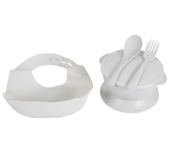 Bavetă din silicon, bol cu capac și bază antiderapantă, linguriță și furculiță – tot ce are nevoie micuțul tău pentru primele mese independente.