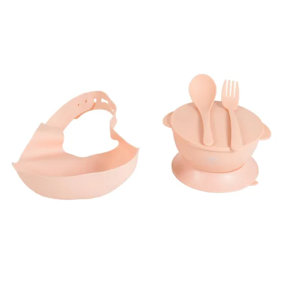 Bavetă din silicon, bol cu capac și bază antiderapantă, linguriță și furculiță – tot ce are nevoie micuțul tău pentru primele mese independente.