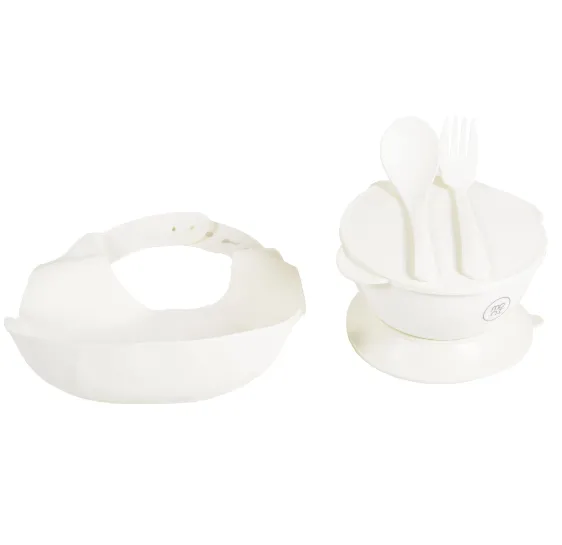 Bavetă din silicon, bol cu capac și bază antiderapantă, linguriță și furculiță – tot ce are nevoie micuțul tău pentru primele mese independente.