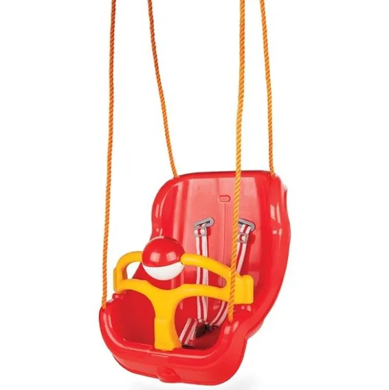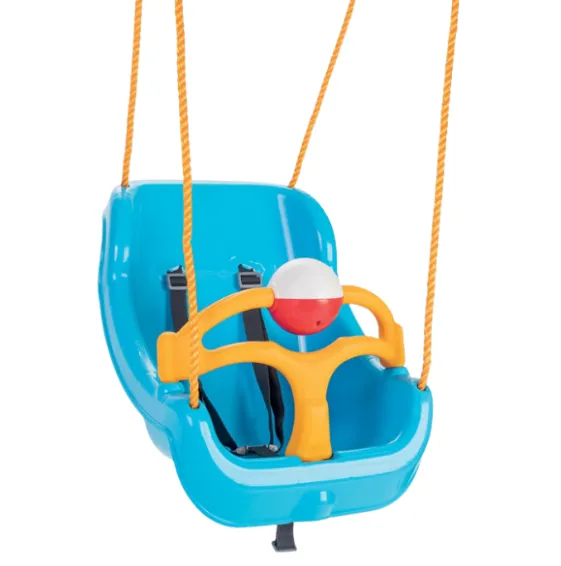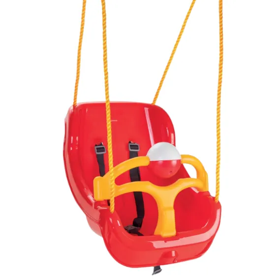 Șezutul leagănului se potrivește pentru copiii de la varsta de 1 an și dispune de suport pentru spate, dotat cu centuri de siguranță, iar in față o bară de protecție detașabilă în formă de T (cu zornăitoare). De asemenea, în set cu leagănul sunt incluse frânghii sintetice flexibile cu carabine.