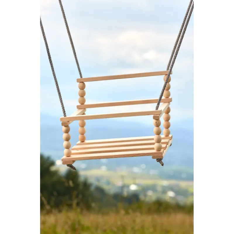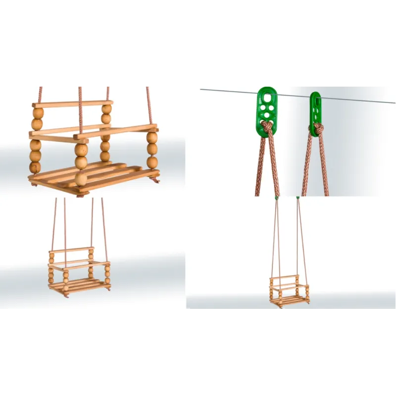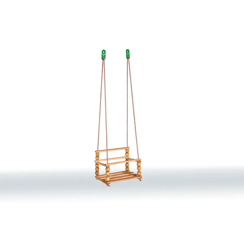 Качели изготовлены из массива дерева бук. Все детали тщательно отшлифованы и покрыты экологически льняным маслом, которое является безопасным для ребенка. По всему ее периметру предусмотрены ограничители, одним из них выступает непосредственно спинка. Детали соединены между собой синтетической прочной веревкой.