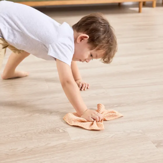 Prin imitare, micuțul tău ajutor poate să pretindă că face curat în timp ce tu faci curățenie în casă. Poate folosi mătură pentru a aduna mizeria în faras și apoi să spele podeaua cu mopul, folosind peria și prosopul pentru a lustruie.