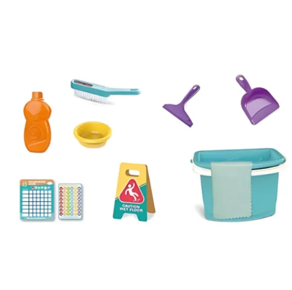 Acest set de curățenie pentru copii cu găleată este un mod excelent de a-i învăța pe cei mici bazele menținerii curățeniei. Setul include diverse instrumente de curățenie, precum perie, făraș, racletă, lighean, sticlă pentru „detergent”, semn de avertizare „Atenție, podea udă” și o găleată practică cu cârpă. Toate piesele sunt fabricate din plastic durabil și sigur. Copiii se pot distra jucându-se de-a curățenia și, în același timp, învățând responsabilitatea pentru curățenia casei. Acest set dezvoltă motricitatea fină, coordonarea mișcărilor și imaginația. O jucărie ideală pentru copiii care adoră să ajute la treburile casnice.