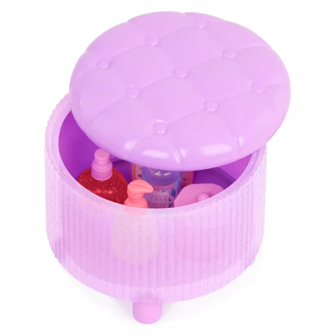Blatul setului este plin cu diverse accesorii, cum ar fi sticluțe de jucărie cu loțiune, spray-uri, piepteni și instrumente pentru coafat, ceea ce permite copilului să se cufunde complet în procesul creativ de creare a imaginilor. Designul compact și estetic face ca acest set să fie un complement ideal pentru camera copiilor, dezvoltând imaginația și motricitatea fină.